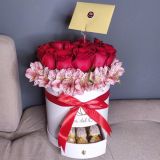 · Sombrerera tipo cofre decorada con cinta satinada u organza, que contiene espuma floral para mantener las flores frescas por más tiempo. Además, en el cajoncito se encuentran 09 chocolates Ferrero Rocher.